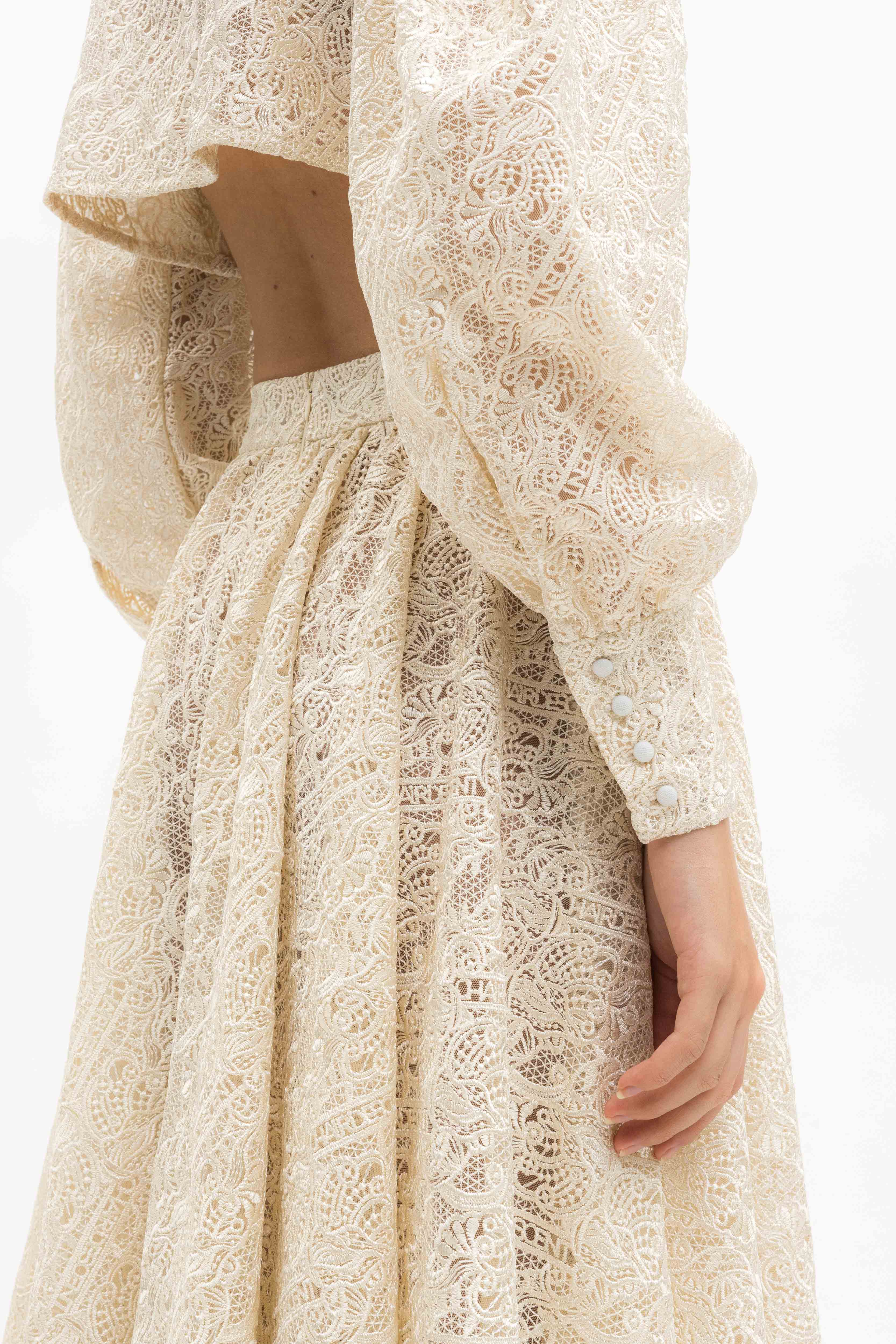 It is crafted from lace fabric. This is for an extravagant yet chic look and it gives shape to a feminine and fearless silhouette. Matching with the Chairidescent signature lace flounce sleeve sheer blouse, it is perfect for your next big thing.