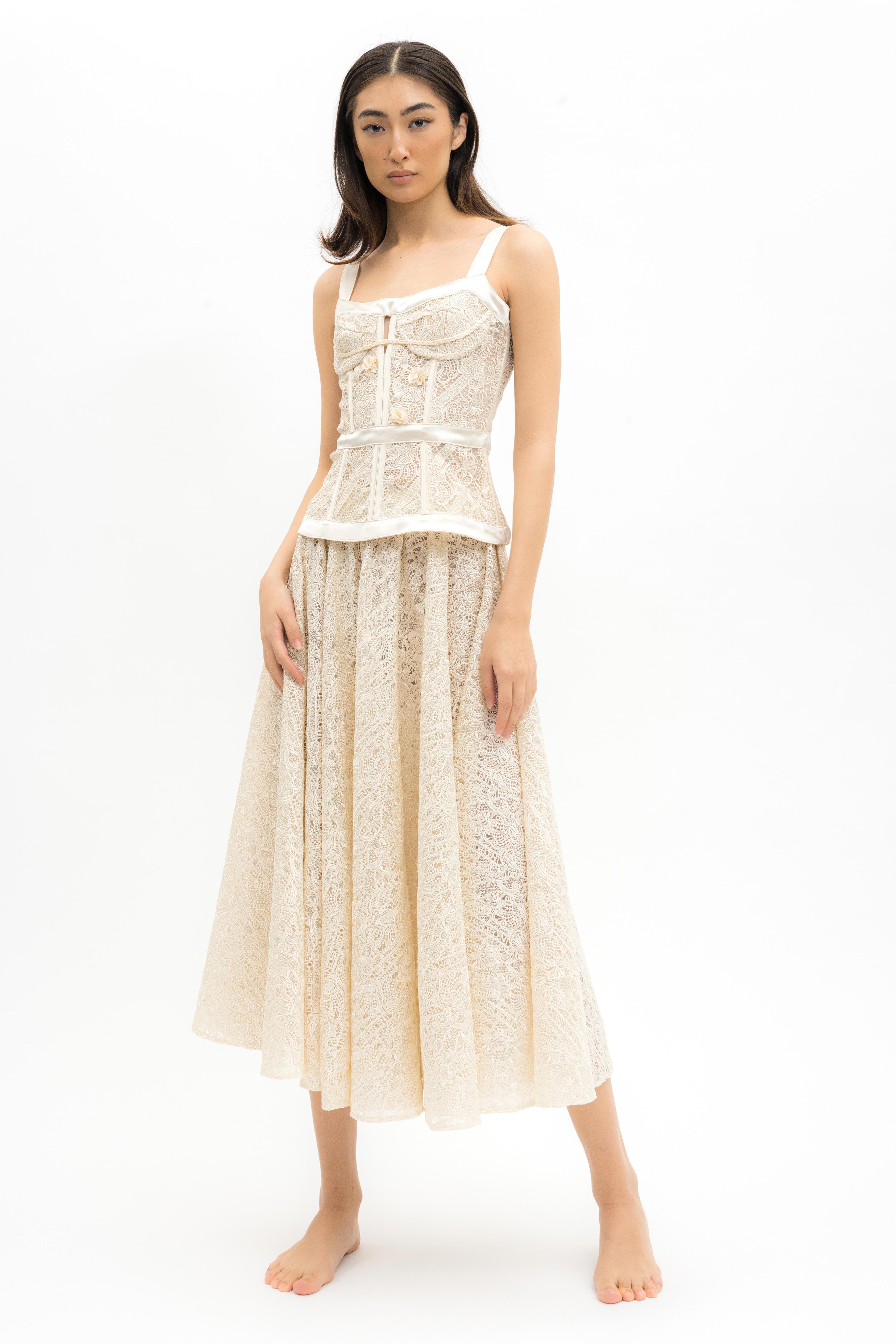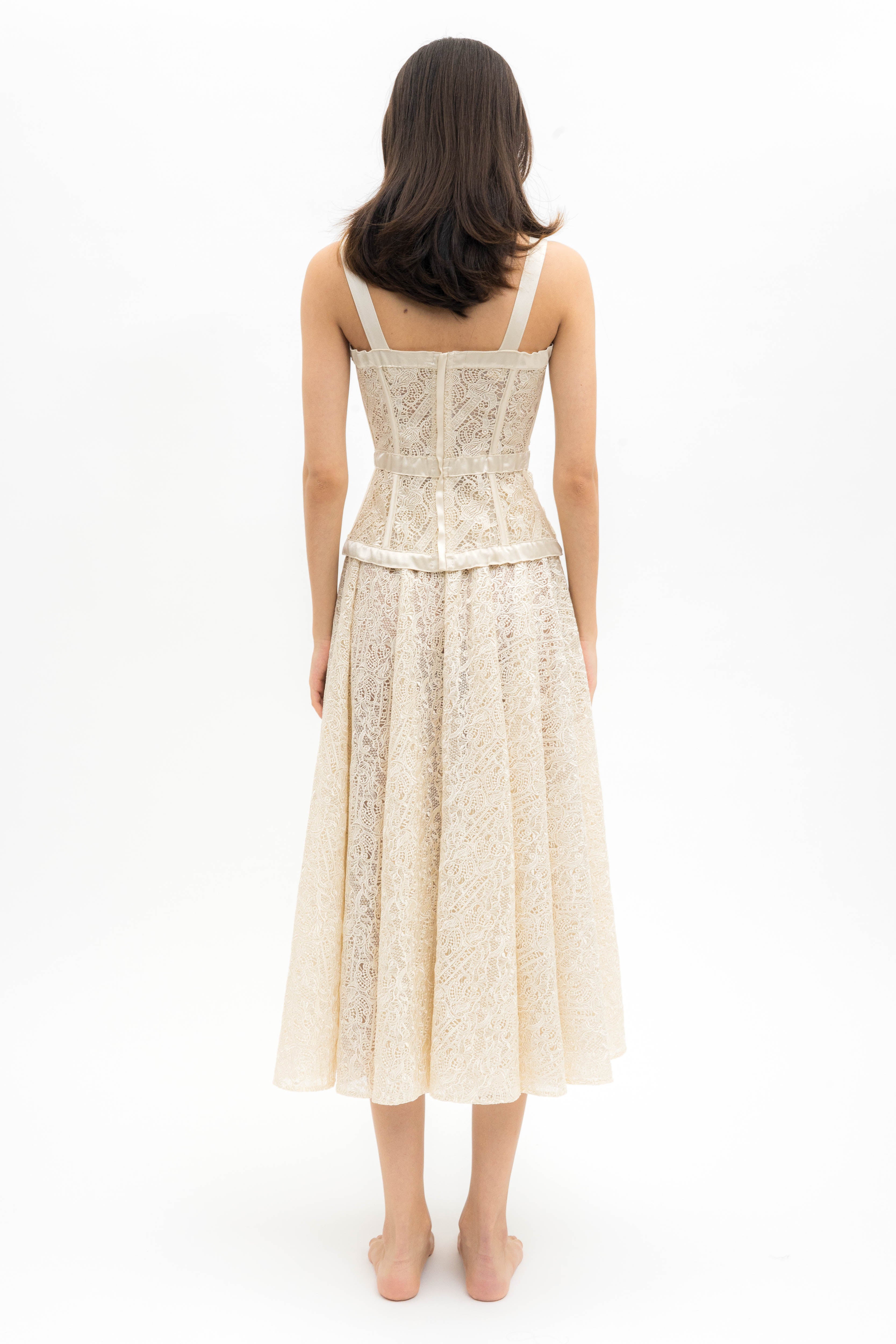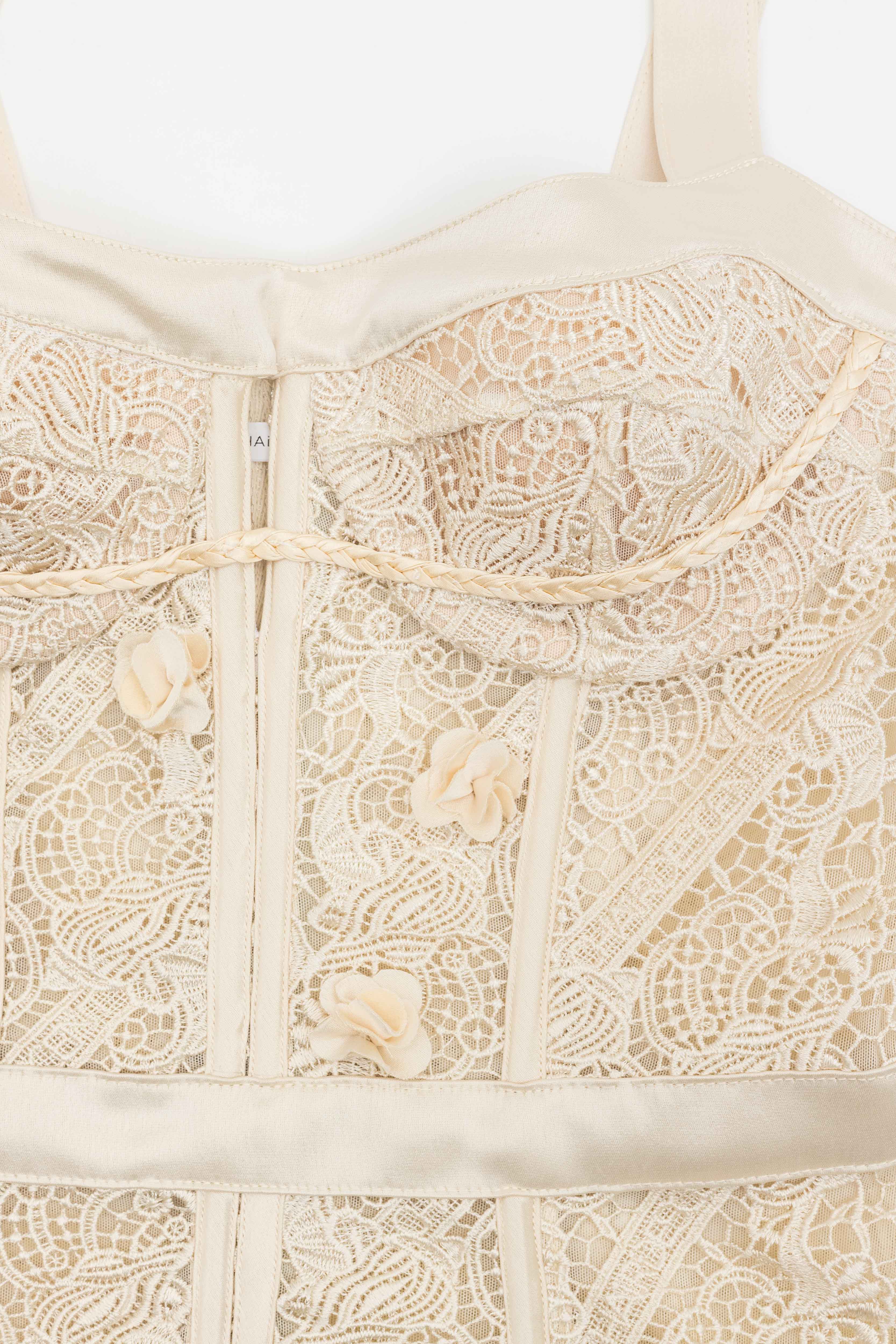 This Chairidescent corset is made from silky satin and feminine Chairidescent signature laces. it has built-in bra/support and beautiful scalloped floral embroidered neckline, it has concealed zip fastening on the back. The weat braids details and the boning accents on the bodice gives shape to a flattering silhouette.