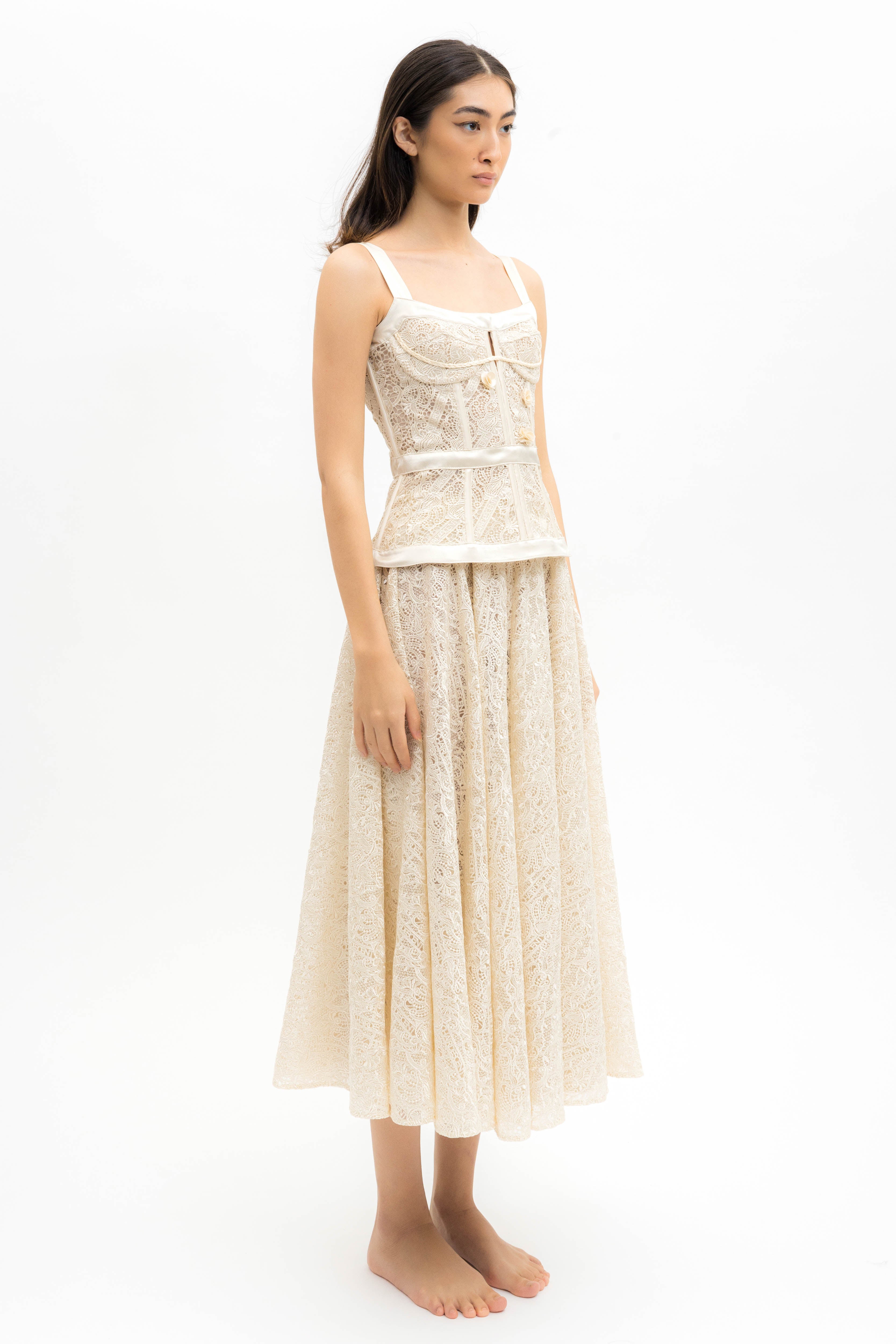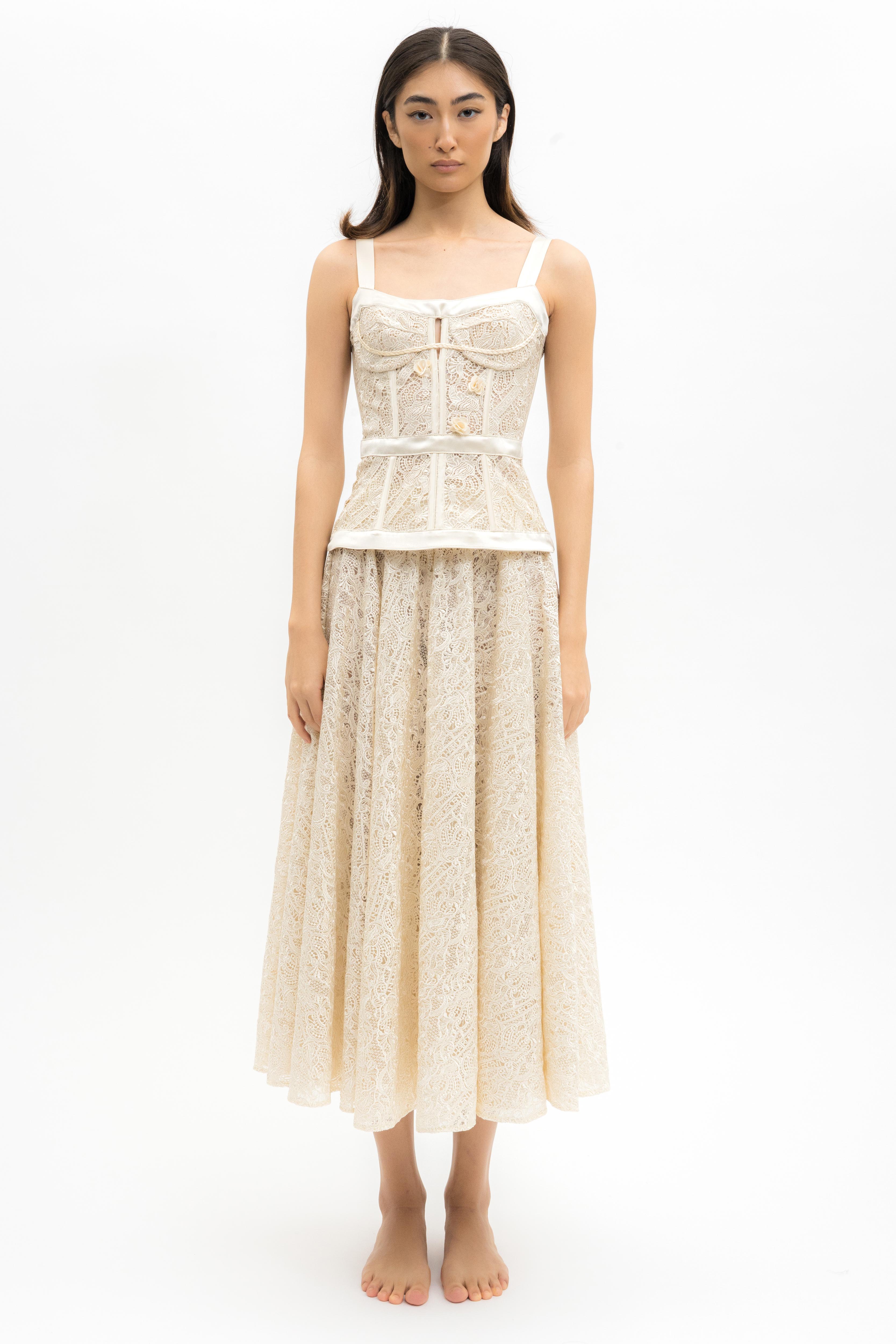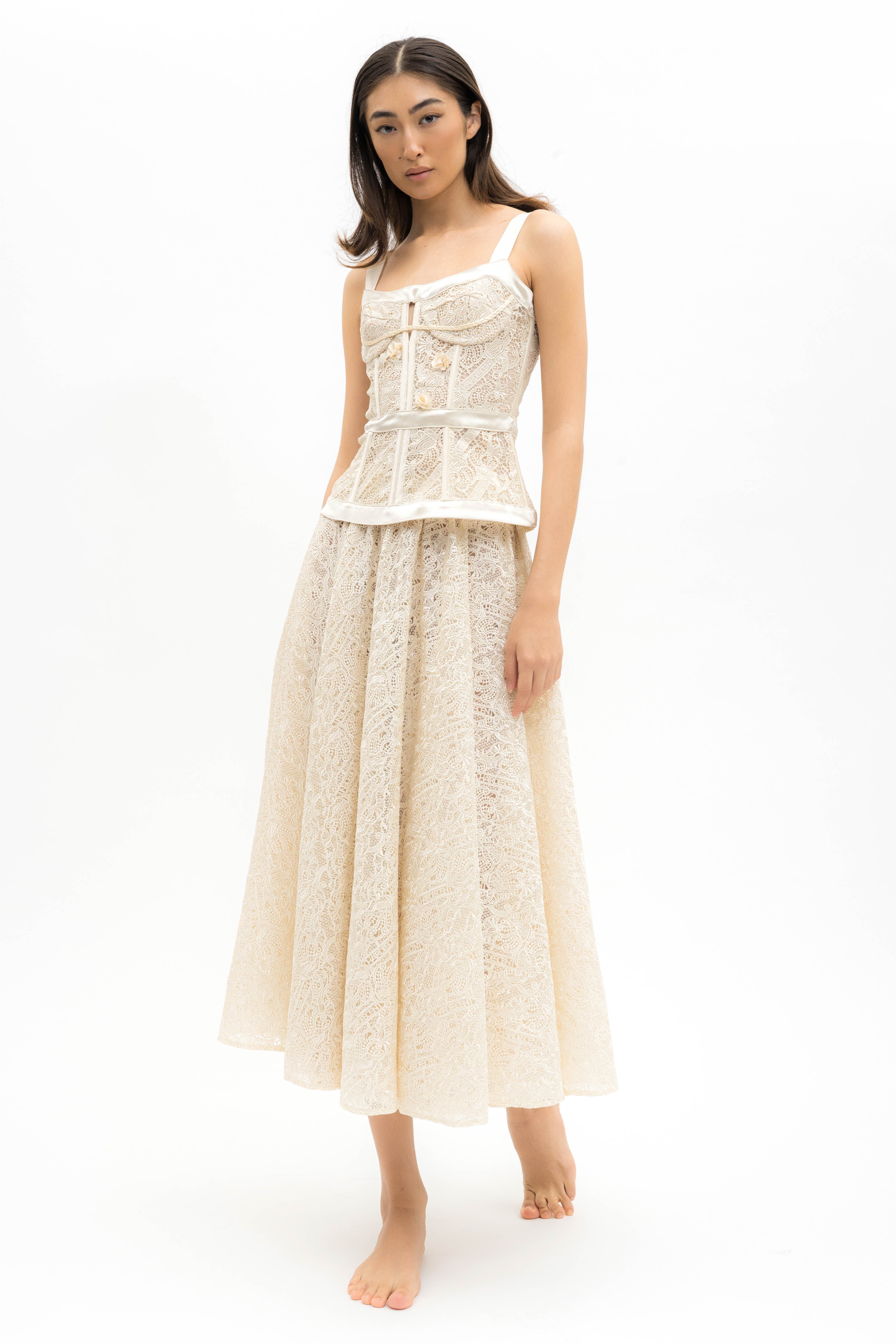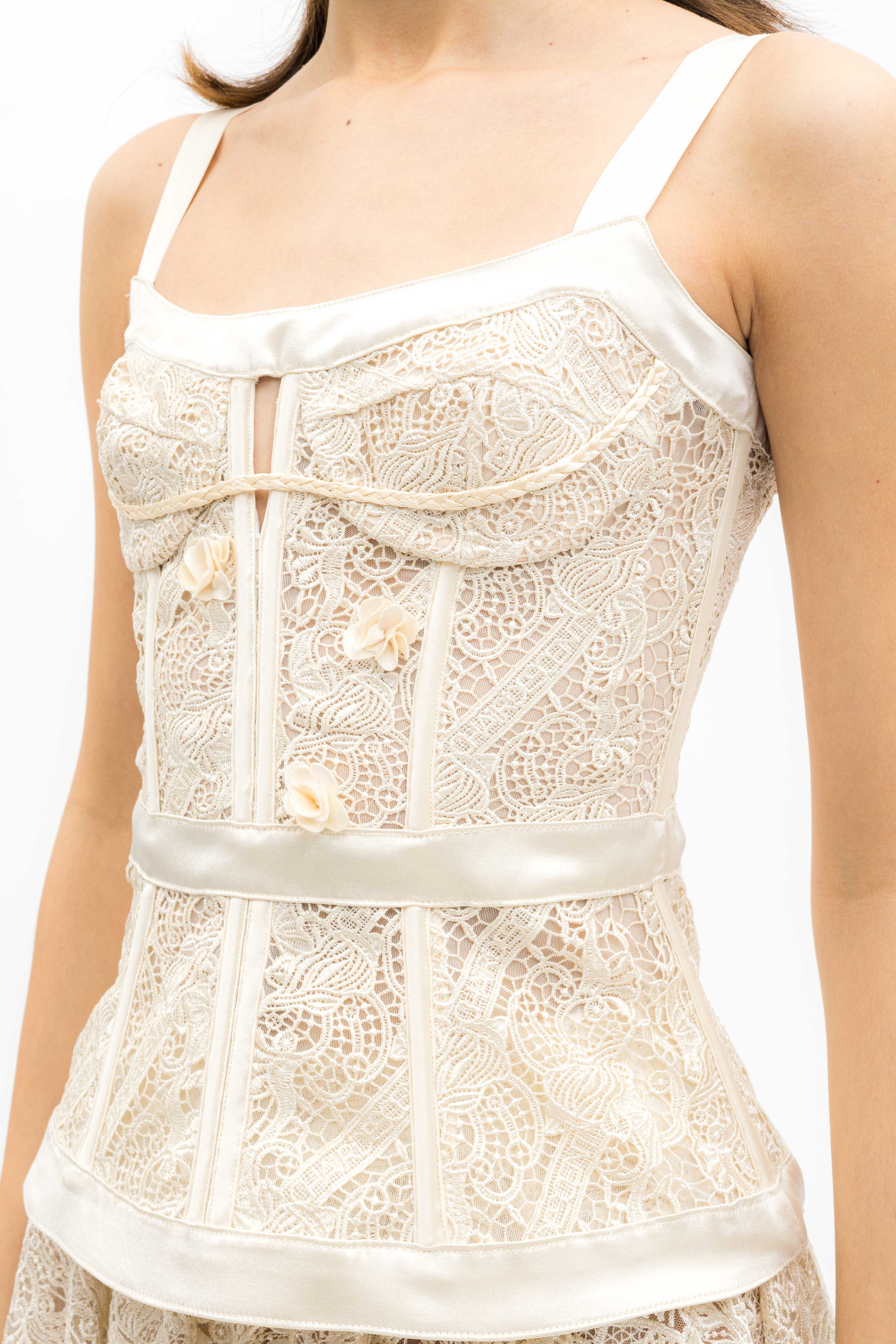 This Chairidescent corset is made from silky satin and feminine Chairidescent signature laces. it has built-in bra/support and beautiful scalloped floral embroidered neckline, it has concealed zip fastening on the back. The weat braids details and the boning accents on the bodice gives shape to a flattering silhouette.
