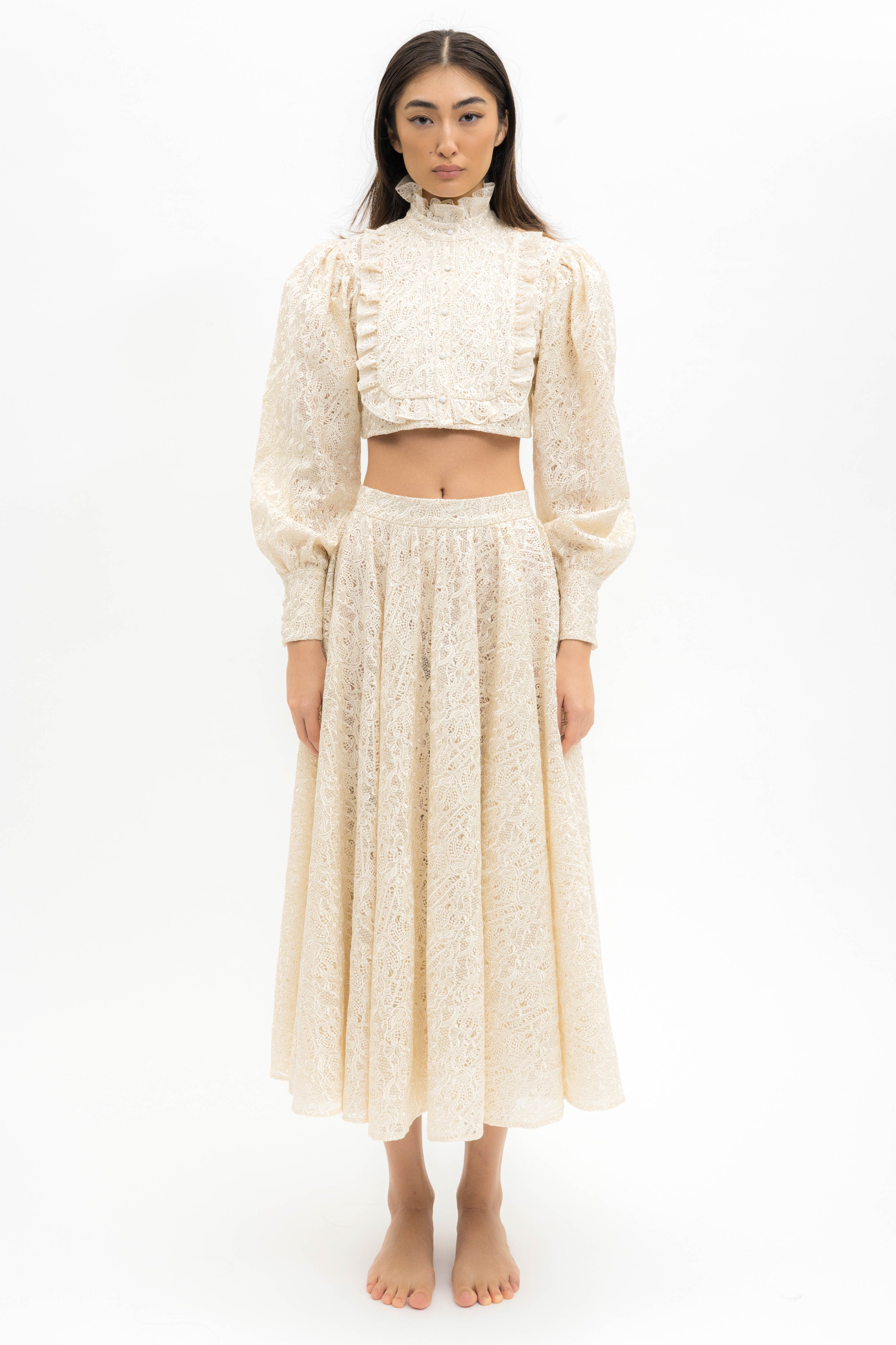 This Chairidescent sheer blouse featuring classic Collar details and oversize balloon sleeves. It is crafted from lace fabric. This is for an extravagant yet chic look and it gives shape to a feminine and fearless silhouette. This blouse is perfect for your next big thing.