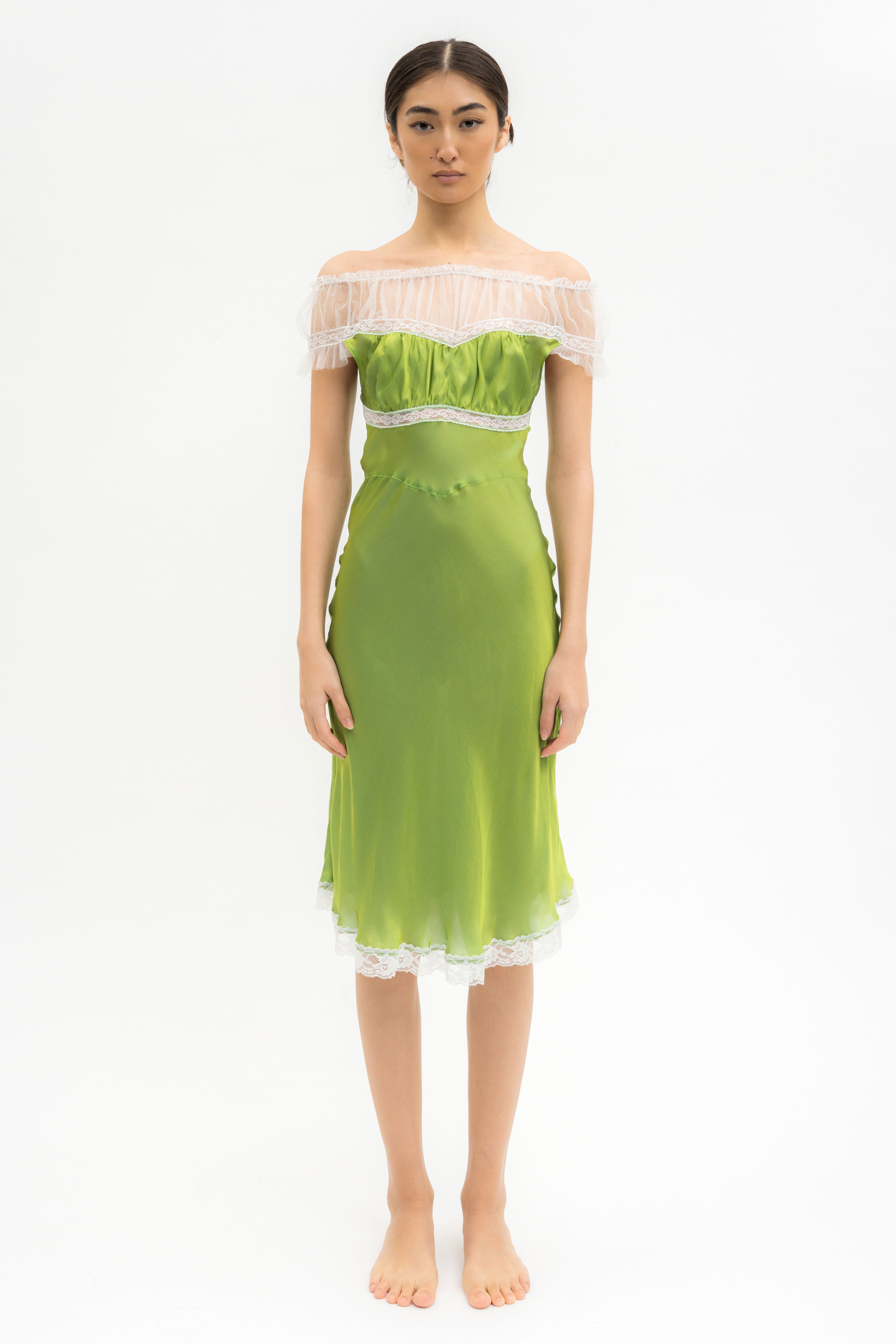 This is a dream. It is a bias cut slip dress made of pure silk and soft lace, it gives shape to a soft, feminine silhouette, like water flows on your skin. Spaghetti straps, the perfect green makes you a spring princess.