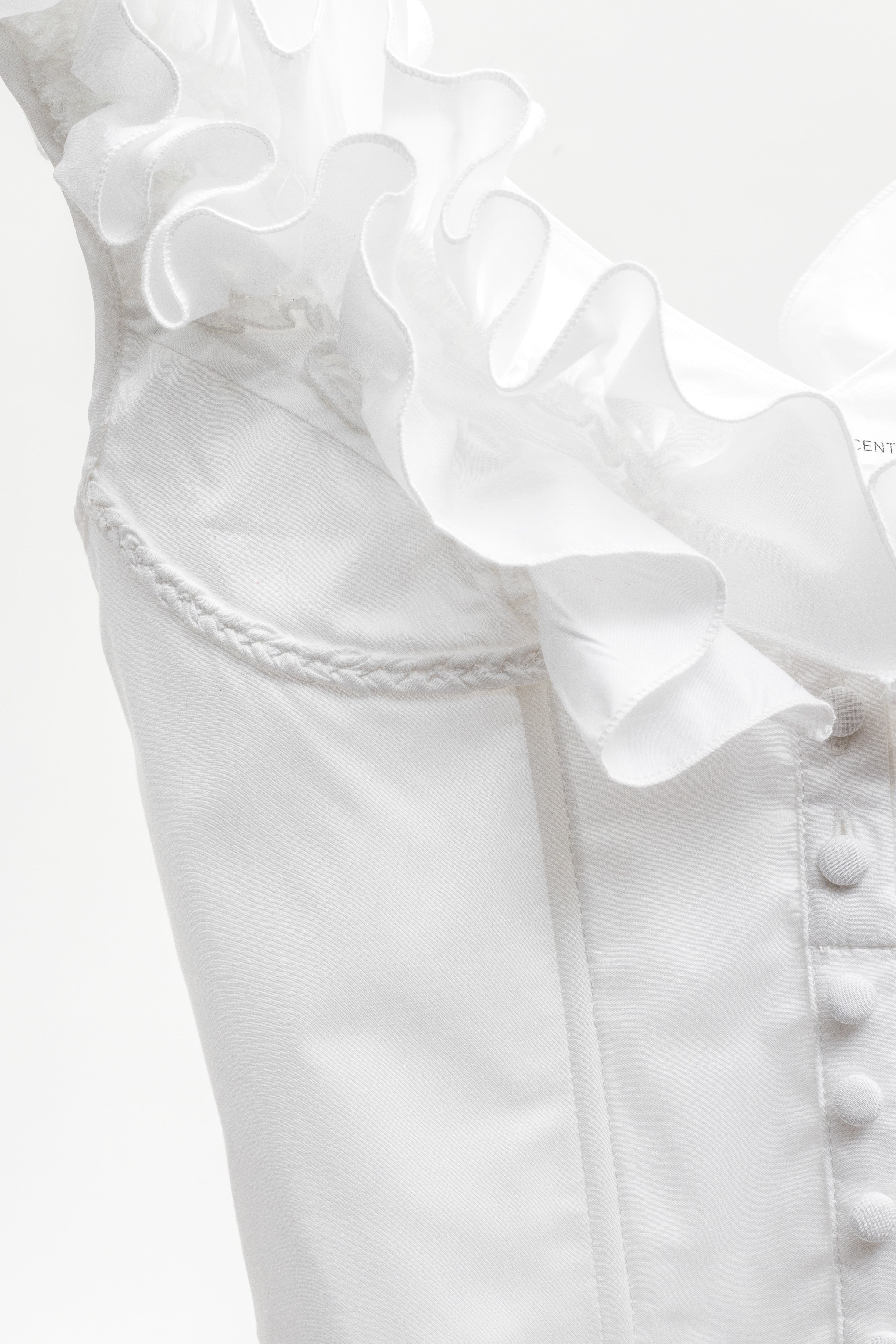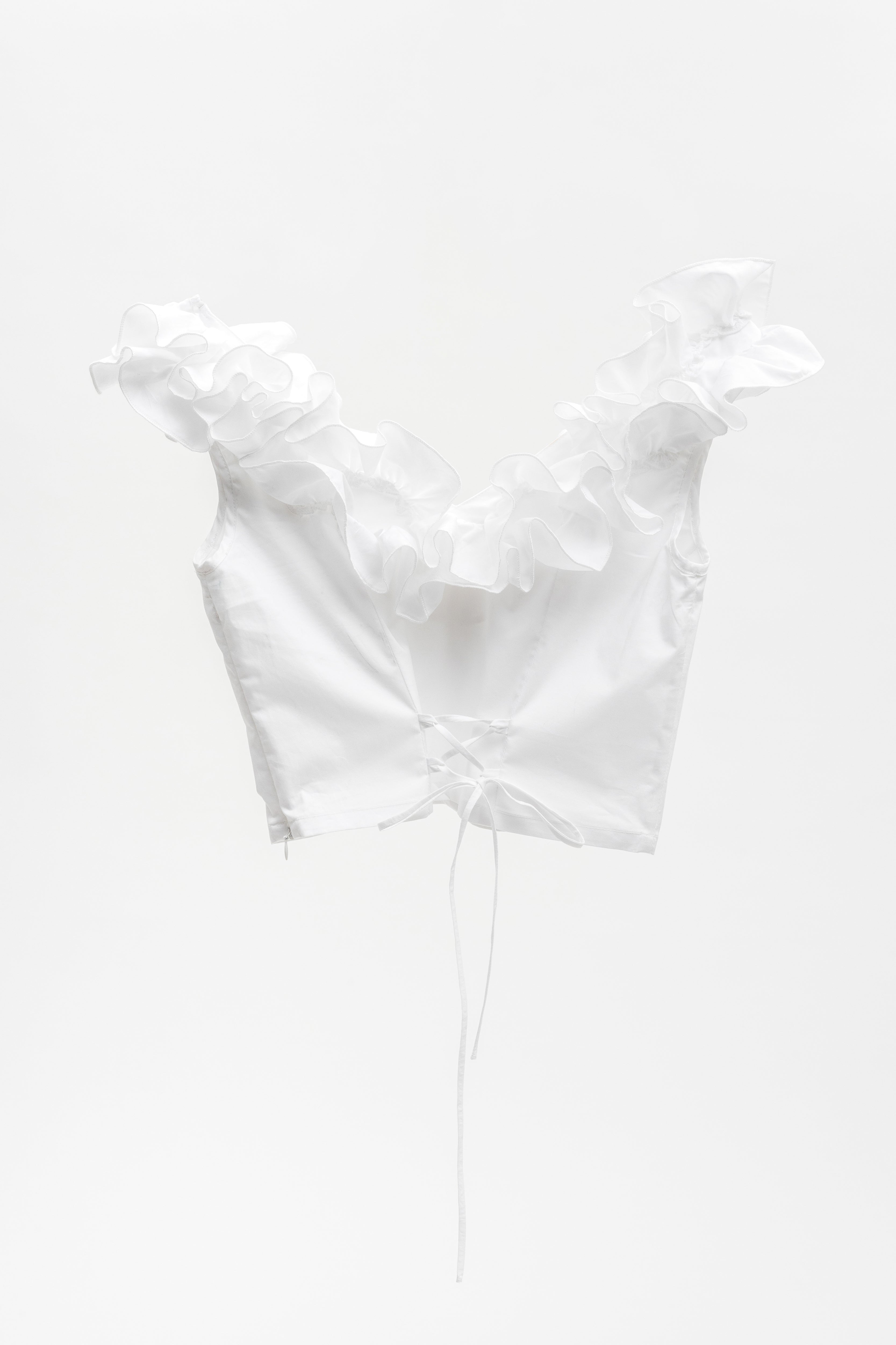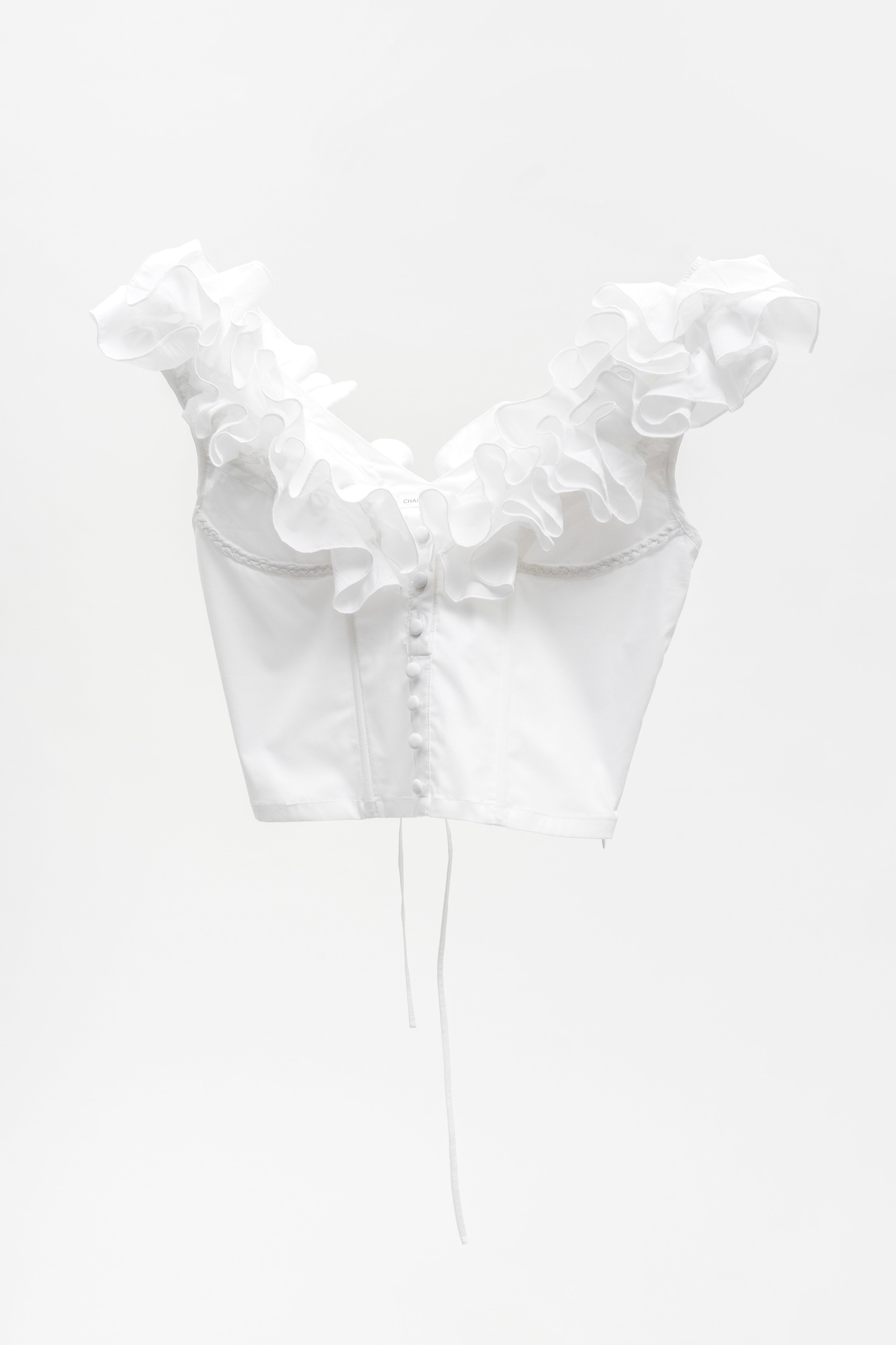 This Chairidescent off-shoulder ruffled cropped top presented in a delicate white hue, the silhouette features voluminous ruffled sleeves that contrast with fitted bodice. It is crafted from cotton/linen blend, it is adjustable with spaghetti straps tied at the back.