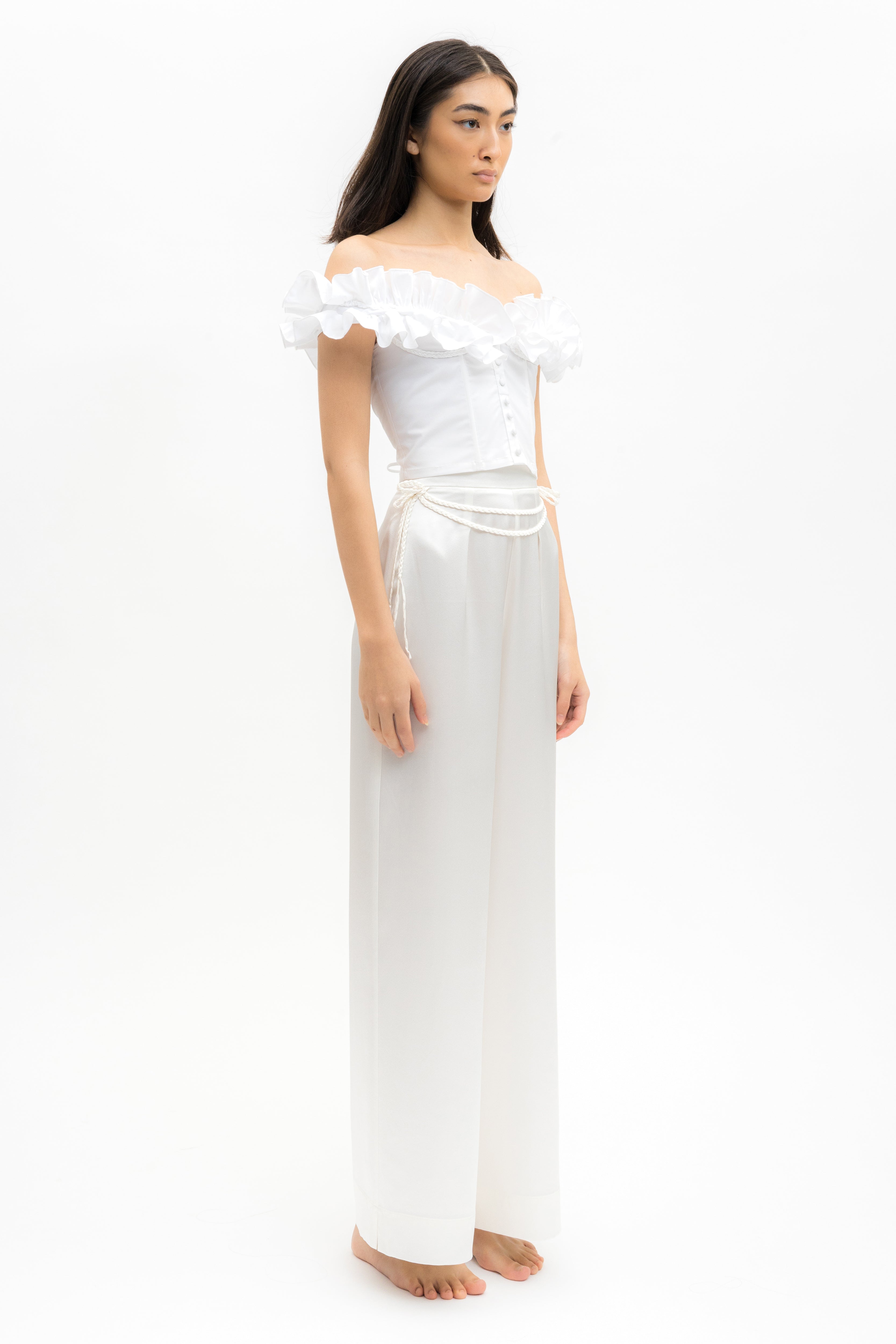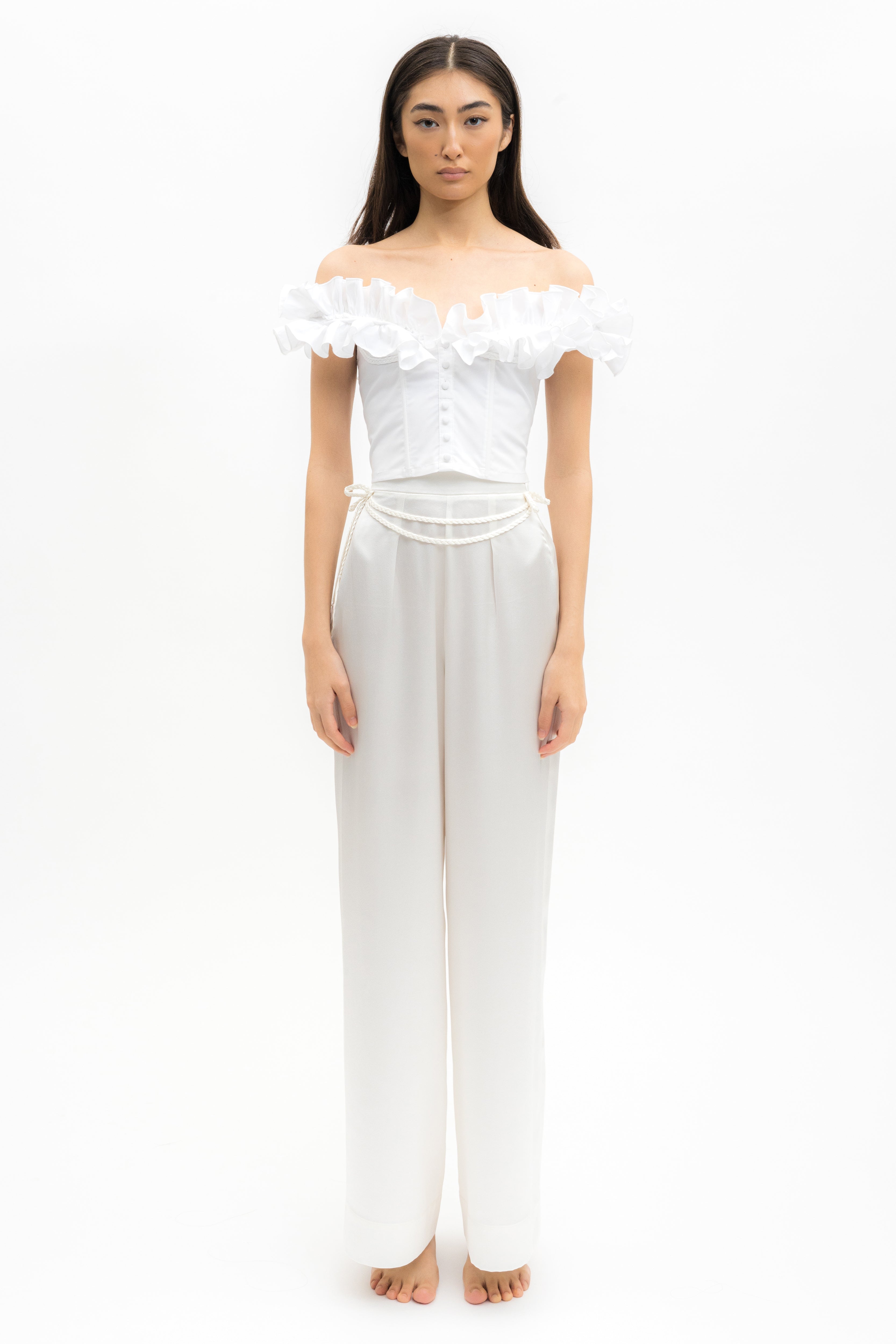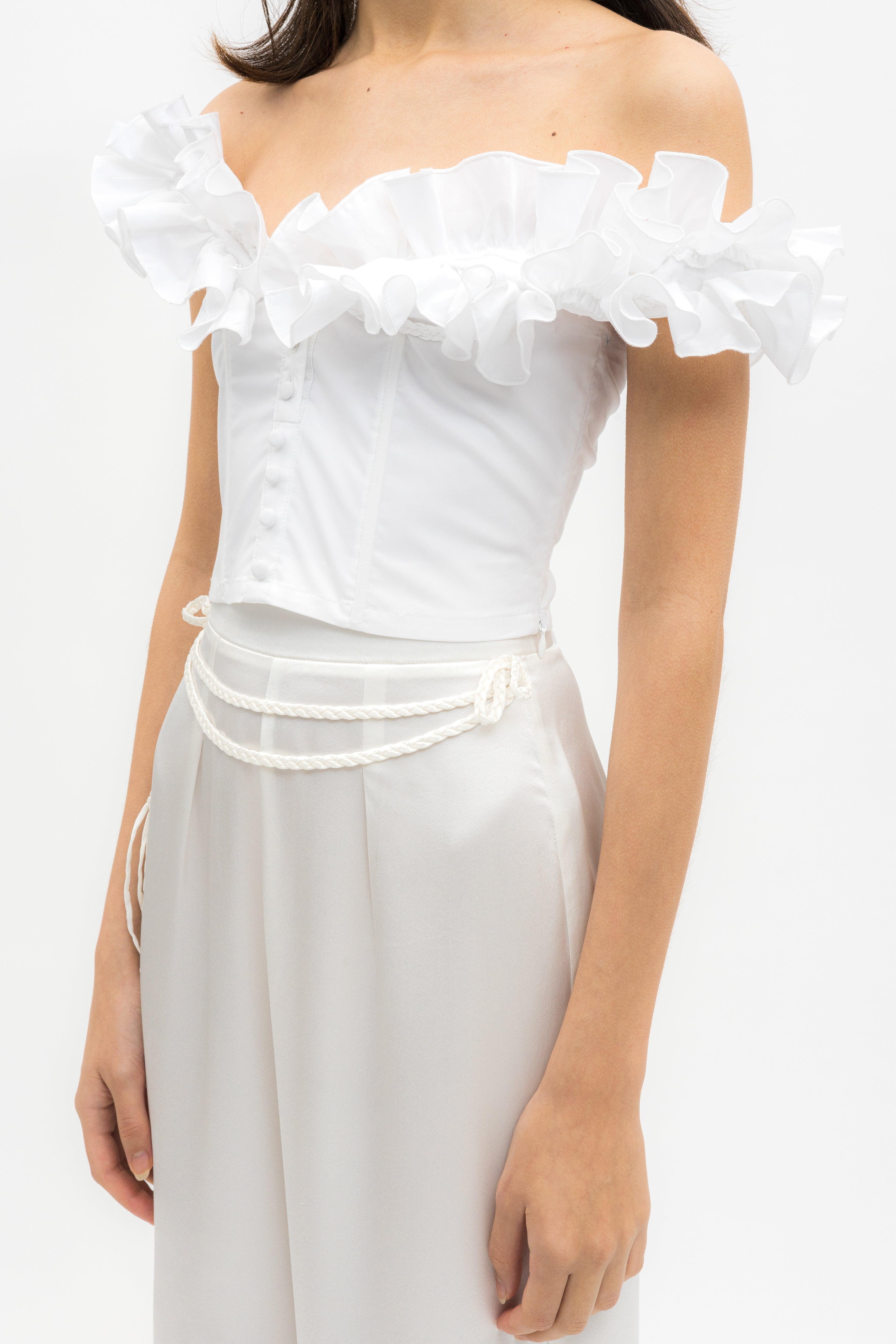 Off-shoulder cotton ruffled structured crop top in white